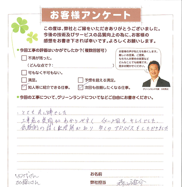 工事前の説明がわかりやすく、イメージ図もキレイでした。依頼前の話に理解があり多くのアドバイスをいただきました。
