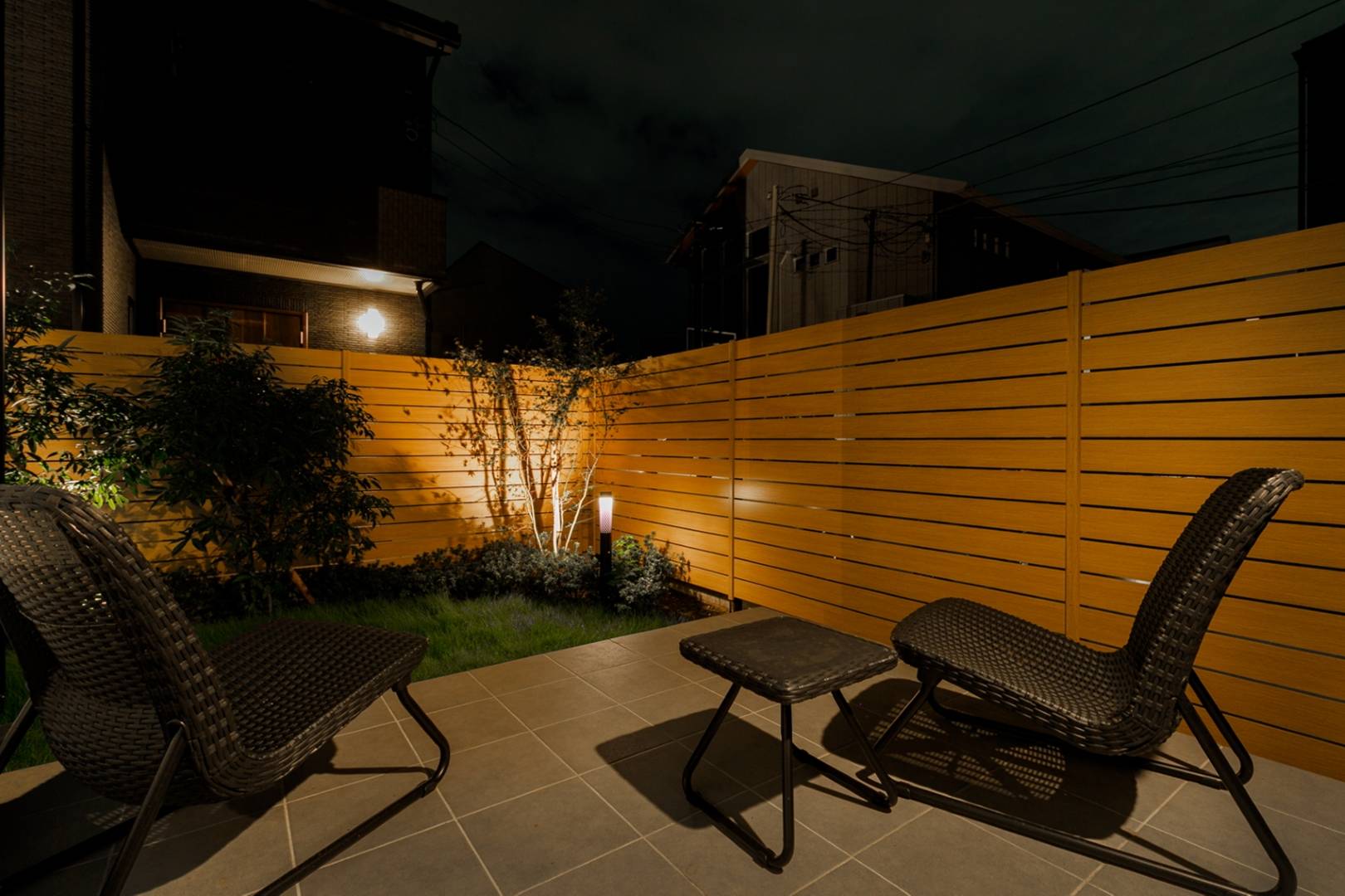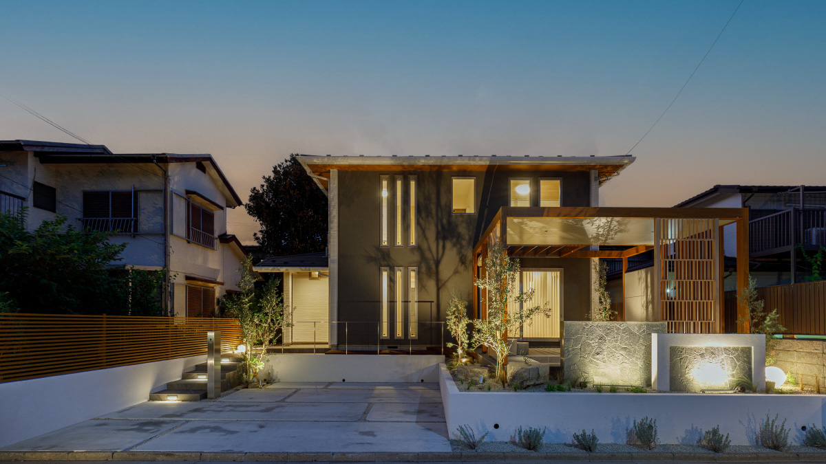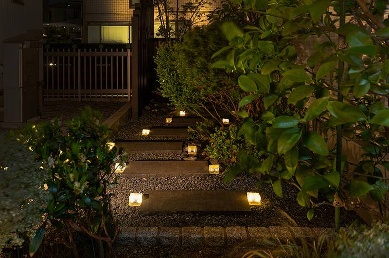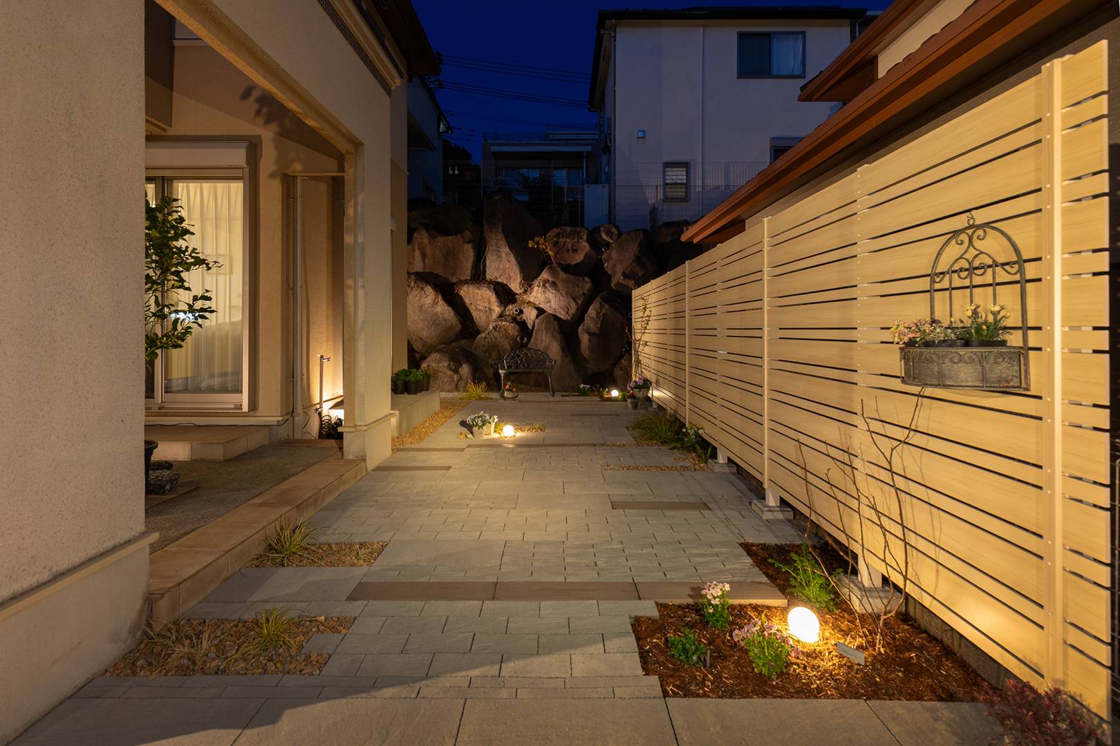豊富なデザインガーデンの施工経験を活かした、家の内と外の調和・外観の美しさ。夜に輝きを増すライティング技術など、街並みに合ったデザイン性の高いお庭造りを実現しました。