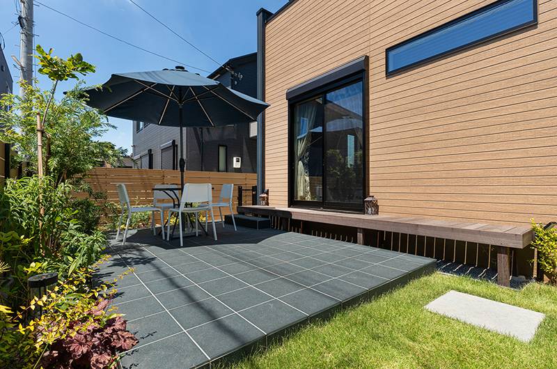 シンプルで大胆なデザインの中に、使いやすさを考えた設計が随所に。目隠しも兼ねた化粧壁や、テラス・屋根・植栽が調和した庭の空間を実際に見て、理想の庭を保つコツも、デザイナーから直接聞くことができます。