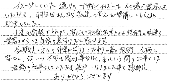 各職人の方々の作業に対するこだわりと高い技術、人柄に安心し、何一つ不安を感じる事もなく、あっという間の工事でした。