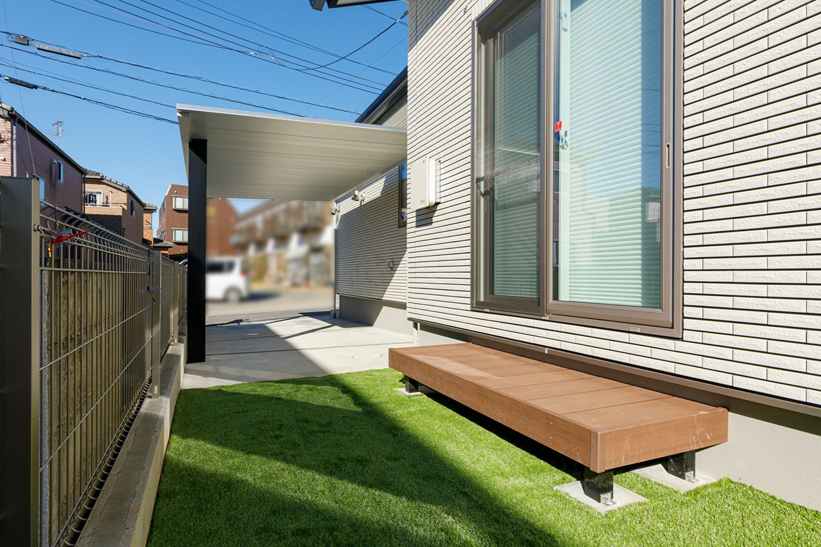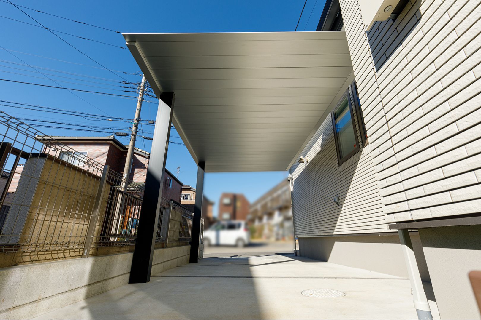 狭い敷地を有効に活用しながら、玄関周りや動線をすっきりとまとめ、使いやすさと見た目の美しさを両立。スタイリッシュなカーポートや目隠しフェンスが、機能性とデザイン性のアクセントになっています。