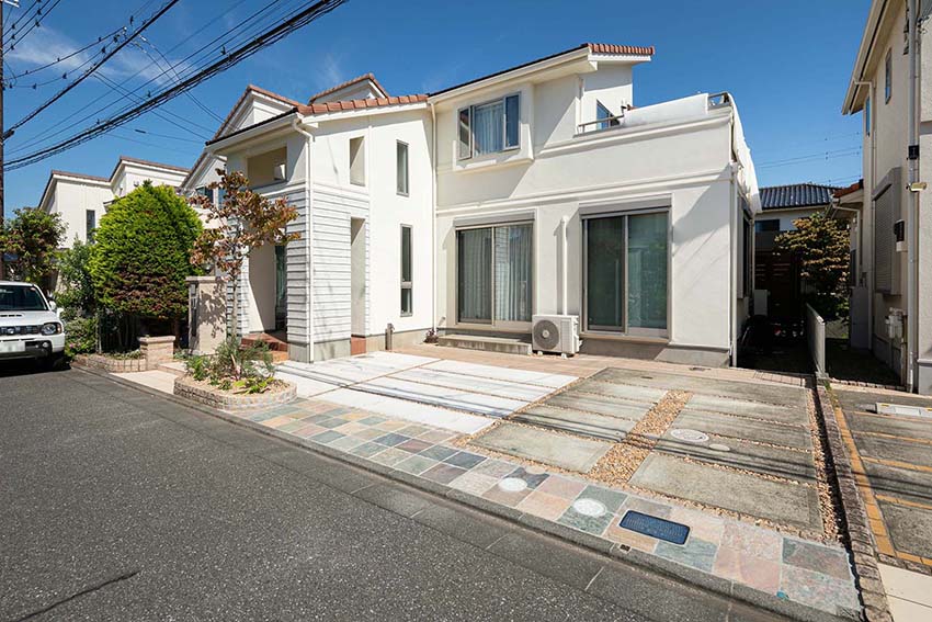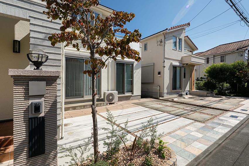 駐車場:擬木の枕木を使用して、ナチュラルテイストの駐車場をご提案。