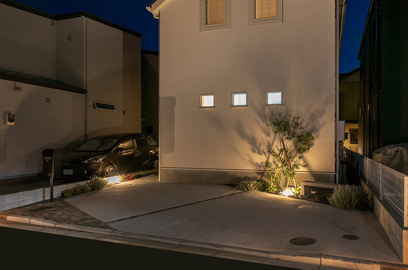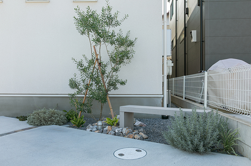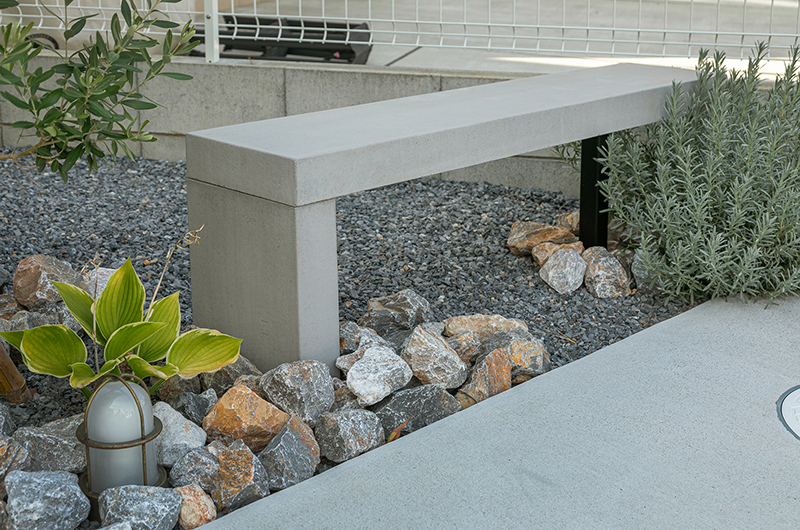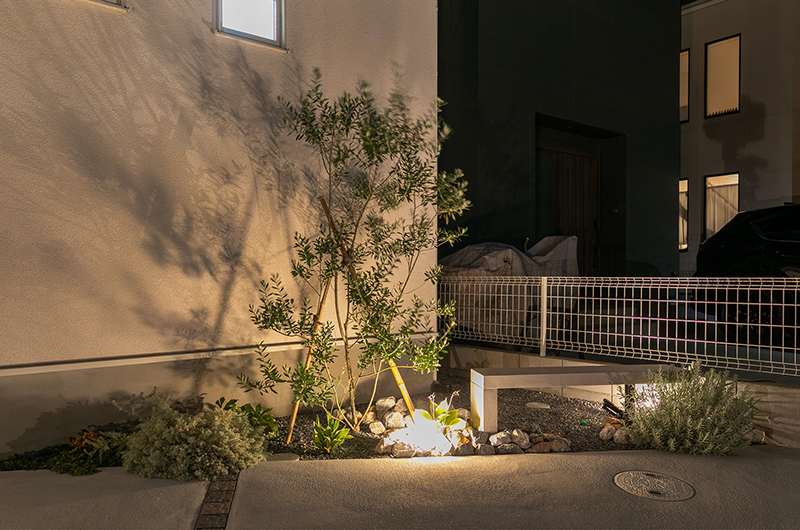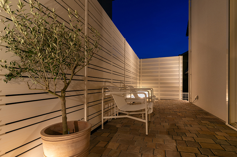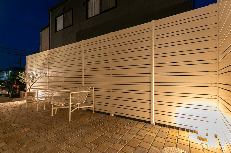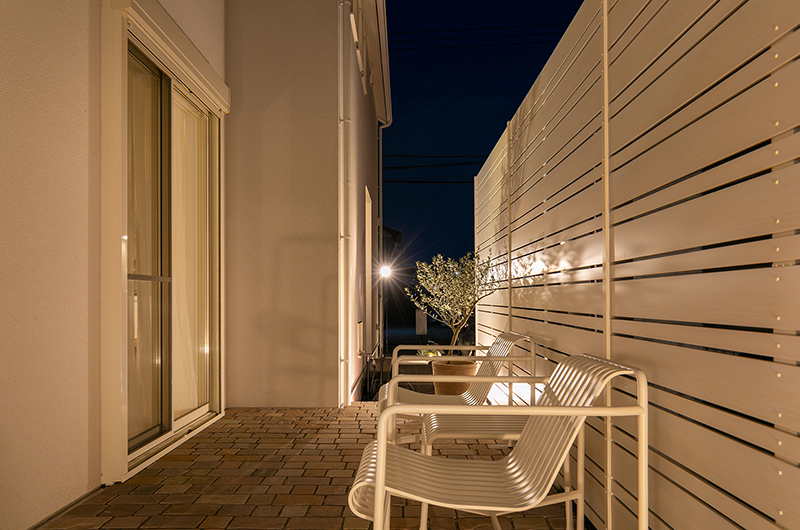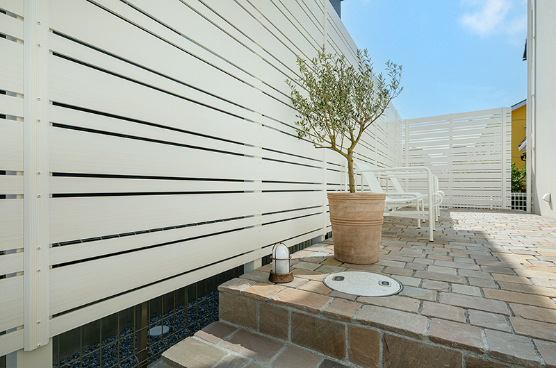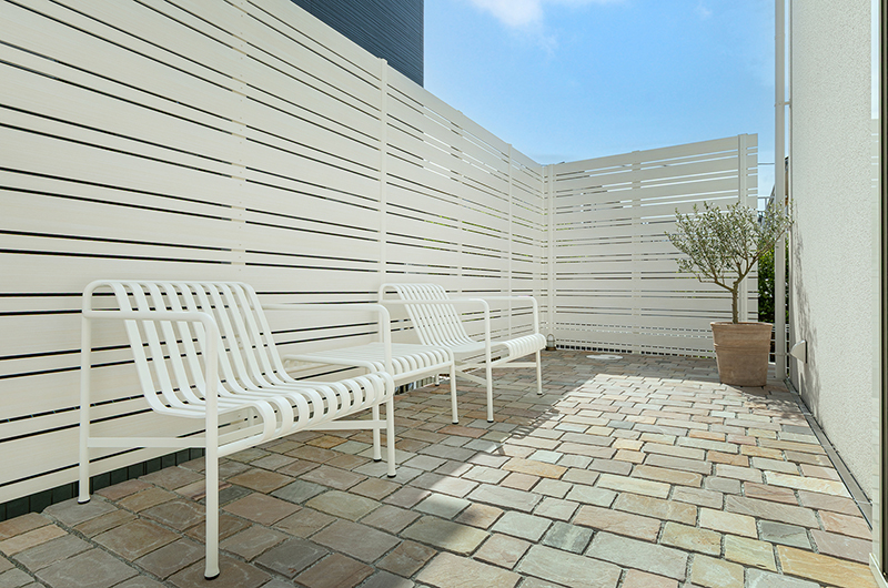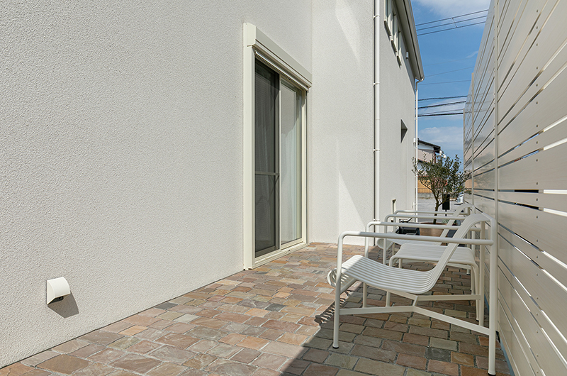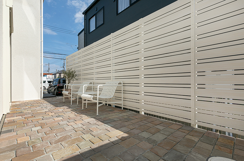 また、お庭側も目隠しでプライベート空間を作り、リビングからの出入りがしやすい自然石テラスでご家族やご友人との集いを楽しめるメンテナンスフリーのアウトドアリビングになっています。