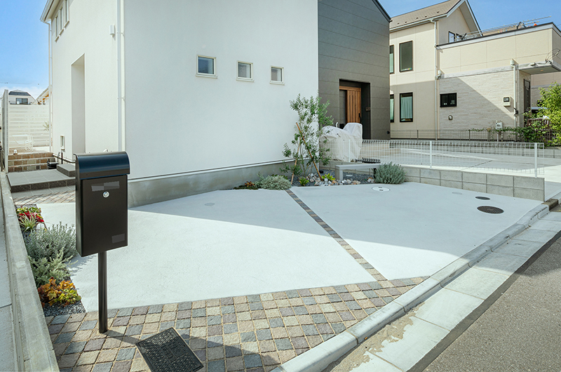 限られた駐車スペースをキューブ型のインターロッキングと植栽の配置は度を工夫し、アクセントデザインでシックな固くなりすぎないデザインでアプローチをデザインさせていただいました。