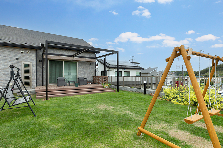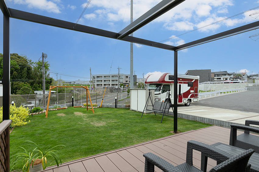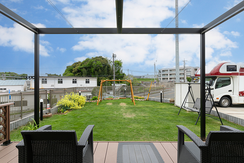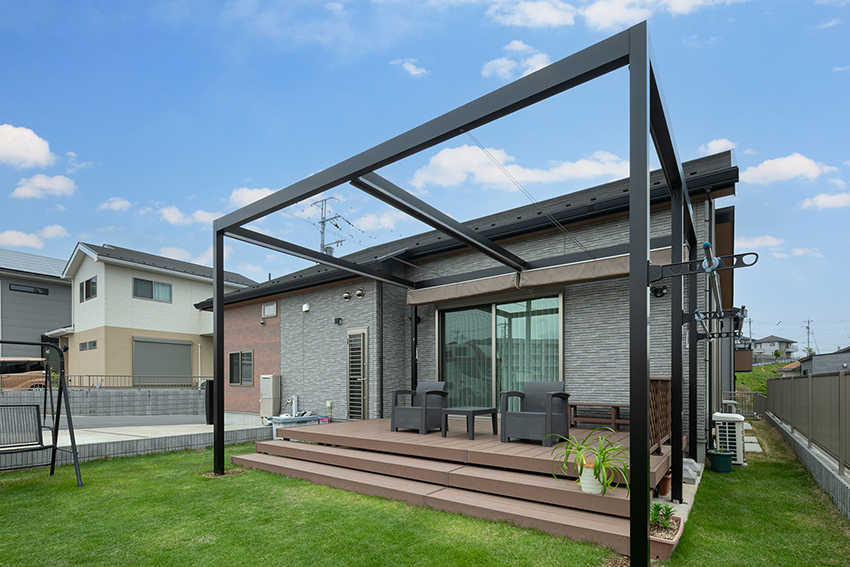 夏は日差しをカットし、冬には日差しを遮らないように開閉できるシェードを計画しました。パーゴラにはダウンライトを設置し、夜でも過ごせる空間となりました。