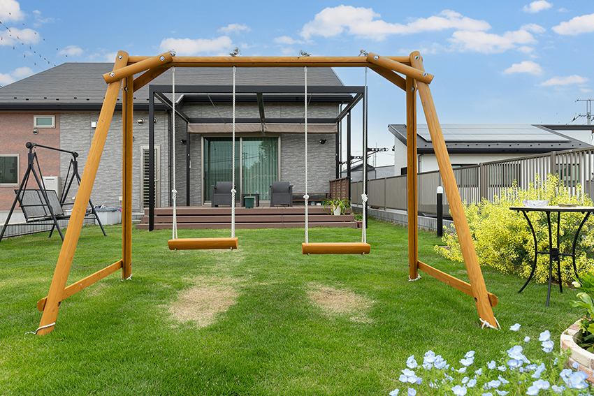 パーゴラの柱に物干し竿がかけられるような工夫も施しました。