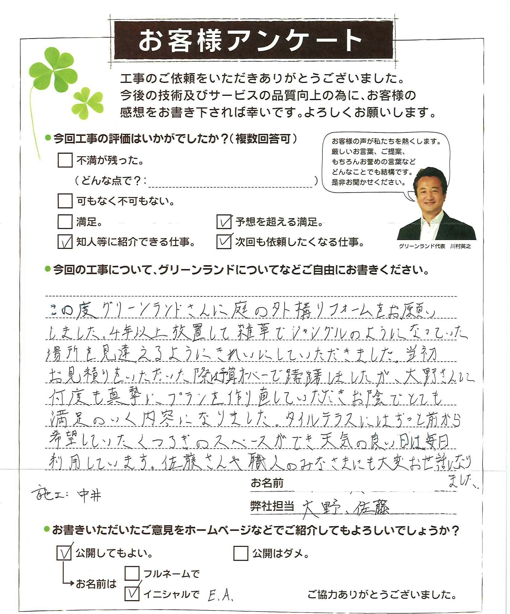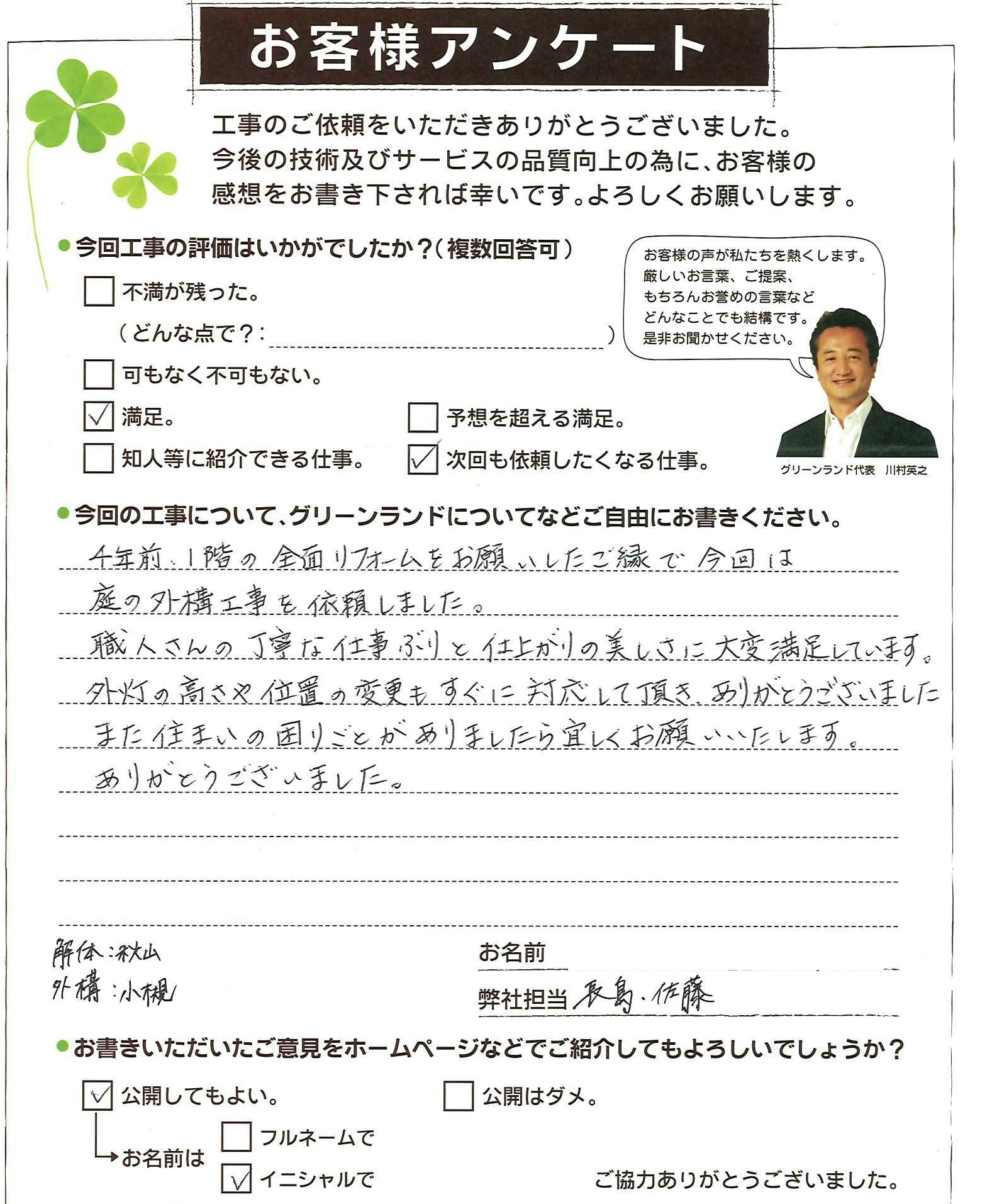 この度グリーンランドさんに庭の外構リフォームをお願いしました。4年以上放置して雑草でジャングルのようになっていた場所を見違えるようにきれいにしていただきました。当初お見積りをいただいた際は予算オーバーで躊躇しましたが、大野さんに 何度も真摯に、プランを作り直していただきお陰でとても 満足のいく内容になりました。タイルテラスにはずっと前から 希望していたくつろぎのスペースができ天気の良い日は毎日利用しています。佐藤さんや職人のみなさまにも大変お世話になりました。