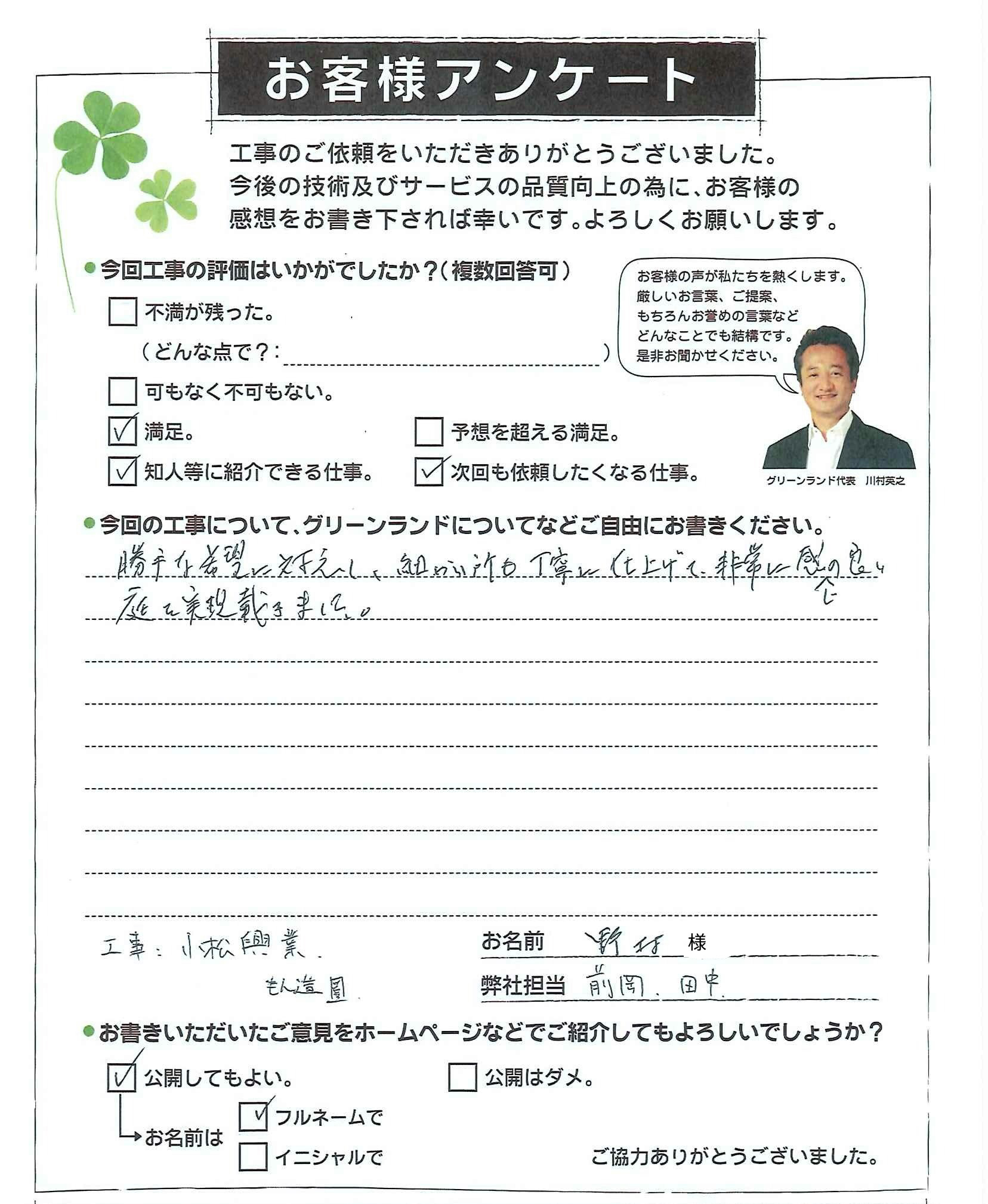 この度は大変お世話になりました。工事の仕上がりには大変満足しており、 貴社にお任せして良かったと感じております。 特に人工芝での仕上がりは期待以上で、貴社の高い技術力を実感いたしました。また、工事期間中の迅速なでご連絡にも感謝しております。 担当の根岸様の提案力と誠実なお人柄は、契約の決め手となりました。 提案内容、人柄、価格、全てにおいて納得できた為貴社を選ばせていただきました。引き渡し後に照明の不具合がありましたが、お伝えしたところすぐに駆けつけてご対応いただけた為アフターフォロー体制にも安心感を憶えました。今後もで想談事があれば、 根岸様に頼りたいと考えております。この度はありがとうございました。