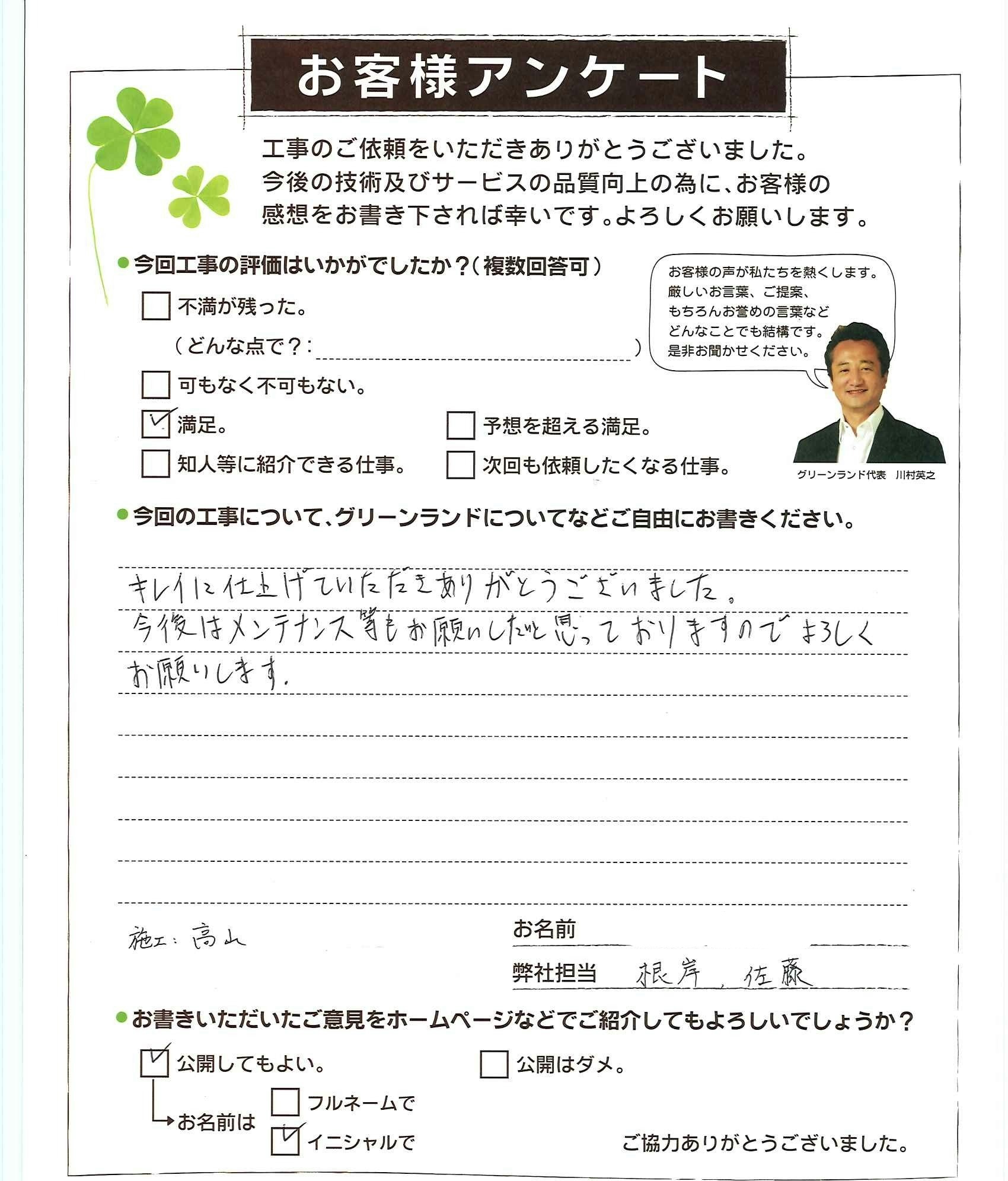 キレイに仕上げていたたきありがとうございました。 今後はメンテナンス等もお願いしたいと思っておりますのでよろしくお願いします。