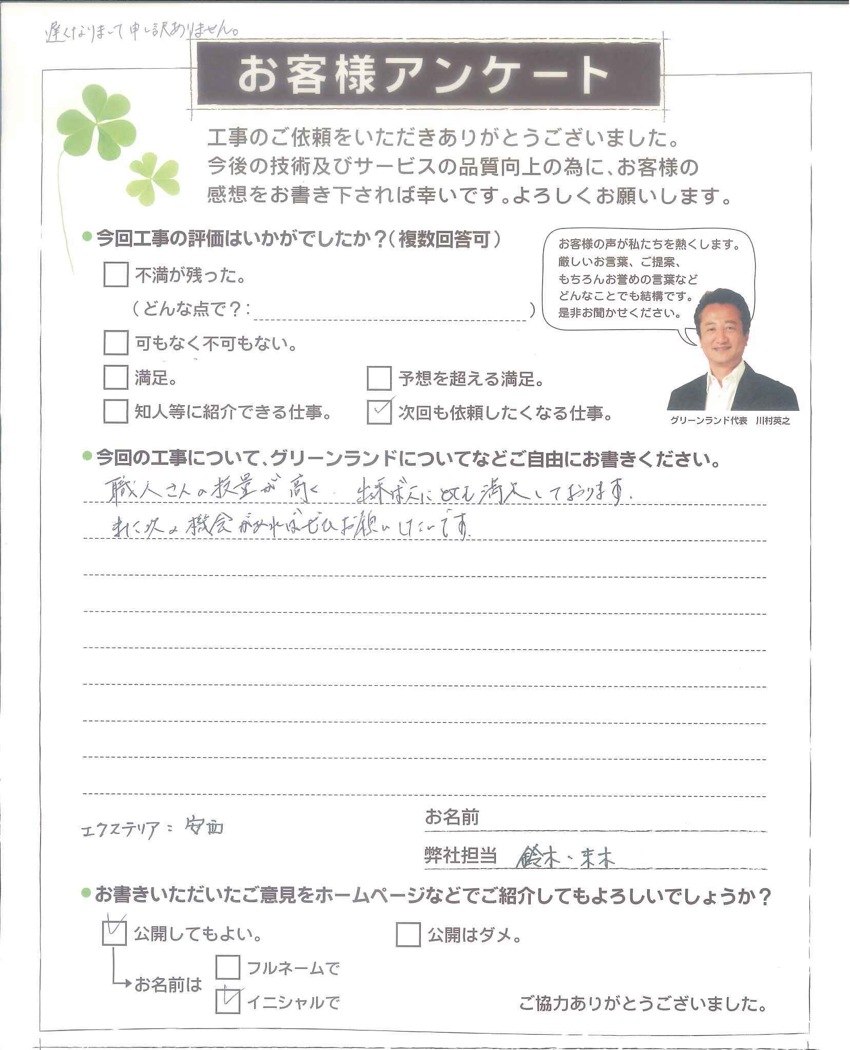 見積もりを依頼し、出来上がった見積もりを見ると、話した内容と異なっていて、こちらに依頼することはないと思いました。しかし他社でも見積もりをしていくうちに、工事内容と価格が良いことがわかってきました。初めに自分たちで考えていた内容ではありませんでしたが、価格のわりに見栄えも良くしっかりした内容だった為こちらで決めさせて頂きました。話した内容と違う見積もりで「何で?」と思っていましたが今となっては間違えてくれて?結果良かったと思っています。満足のいく内容で、庭もすっきり、きれいになり嬉しいです。機会があれば知人に紹介したいと思いました。ありがとうございました。