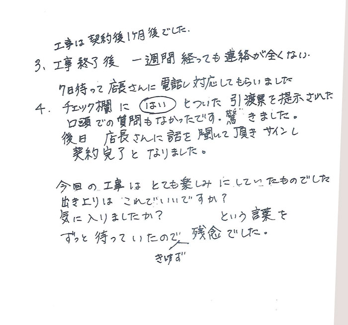 3.工事終了後 一週間経っても連絡が全くない。7日待って店長さんに電話し対応してもらいました。