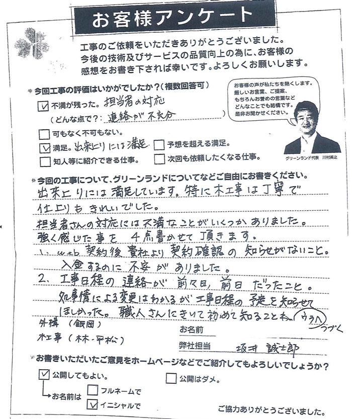 出来上がりには満足しています。特に木工事は丁寧で仕上がりもきれいでした。担当者さんの対応には不満なことがいくつかありました。強く感じたことを4点書かせて頂きます。