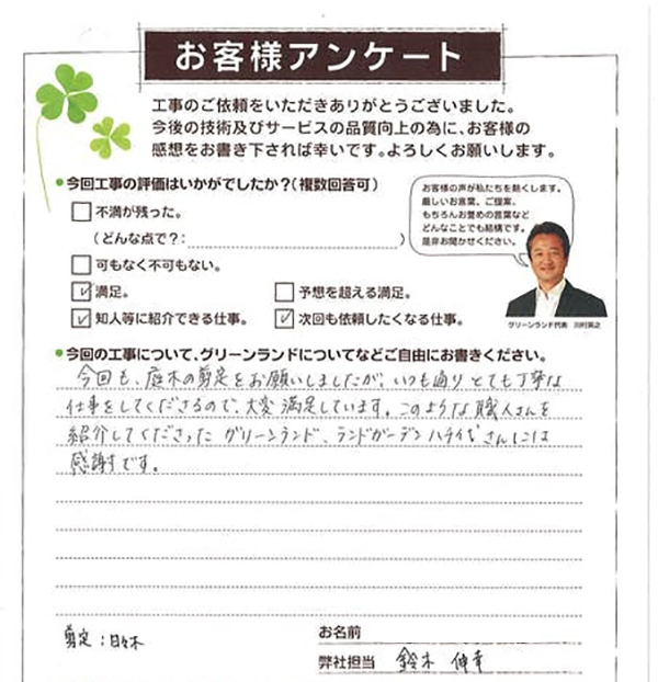プランをたてていただいた時に私の要望をよく聞いて下さり、その要望に沿った提案をしてくださった。しかも相見積をとった他社と比して1番センスが良かった。又タバコの煙が非常に苦手である事を御伝えするとその事を真剣に受けとめてくださり、とても安心しました。そもそもグリーンランドさんが現場での喫煙に関して注意を促してらっしゃる会社との事で、それもこの会社を選択した理由でした。施工時は毎回本当にきれいに片付けをしてくださっており、工事中でもいつもの庭より美しくなっていた位です💦